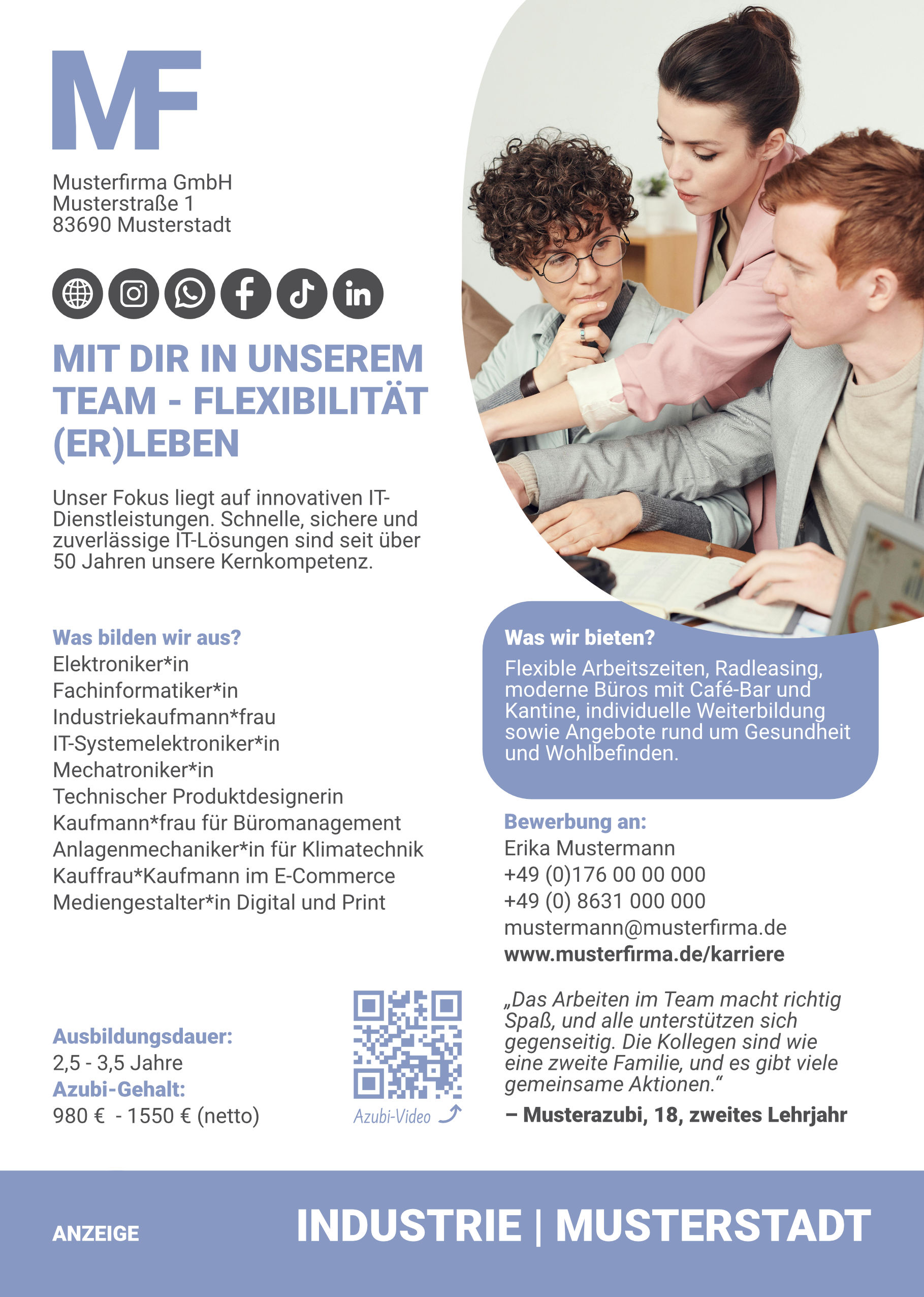 Schicken Sie uns Ihre Anzeige in A5 (mit 3 mm Beschnitt) als PDF, PNG, JPEG oder JPG. Ihre Inhalte können im Original-Ausbildungsmagazin von Azubima© veröffentlicht werden – genau dort, wo junge Menschen auf Ausbildungsplatzsuche sind: direkt bei Schüler*innen und deren Familien.